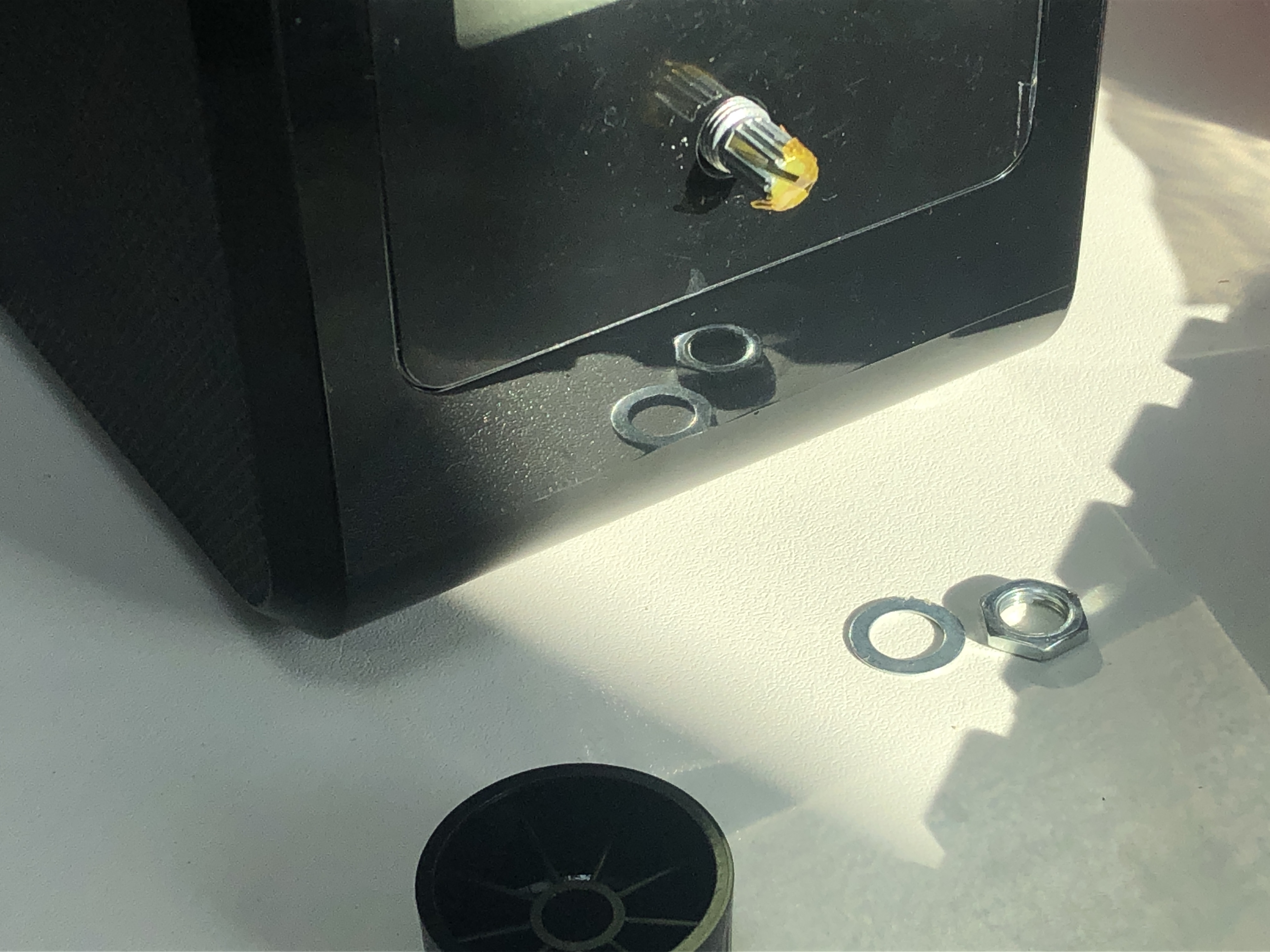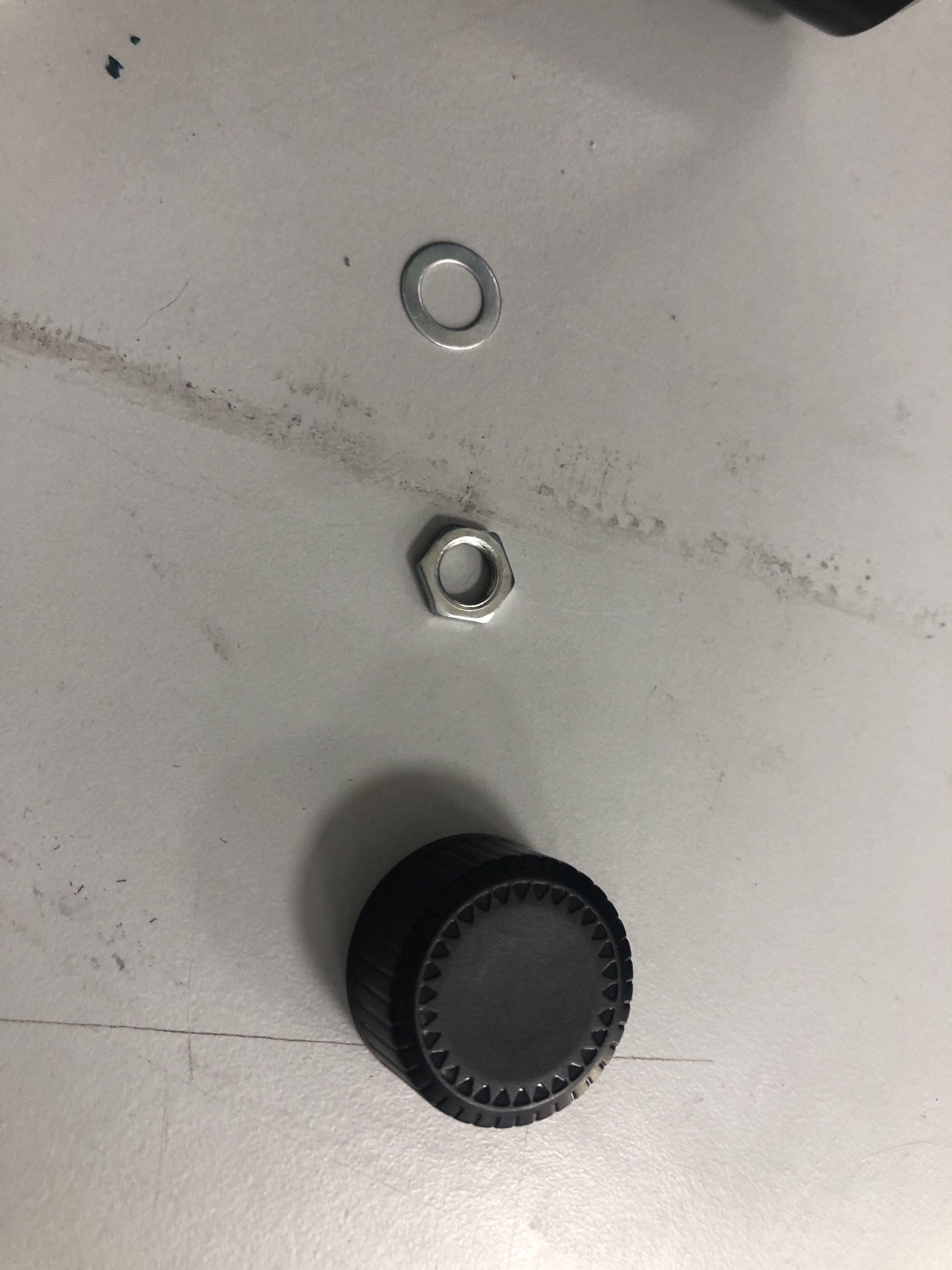 Reinstall the nut and washer behind the scroll button, then reattach the scroll button itself.