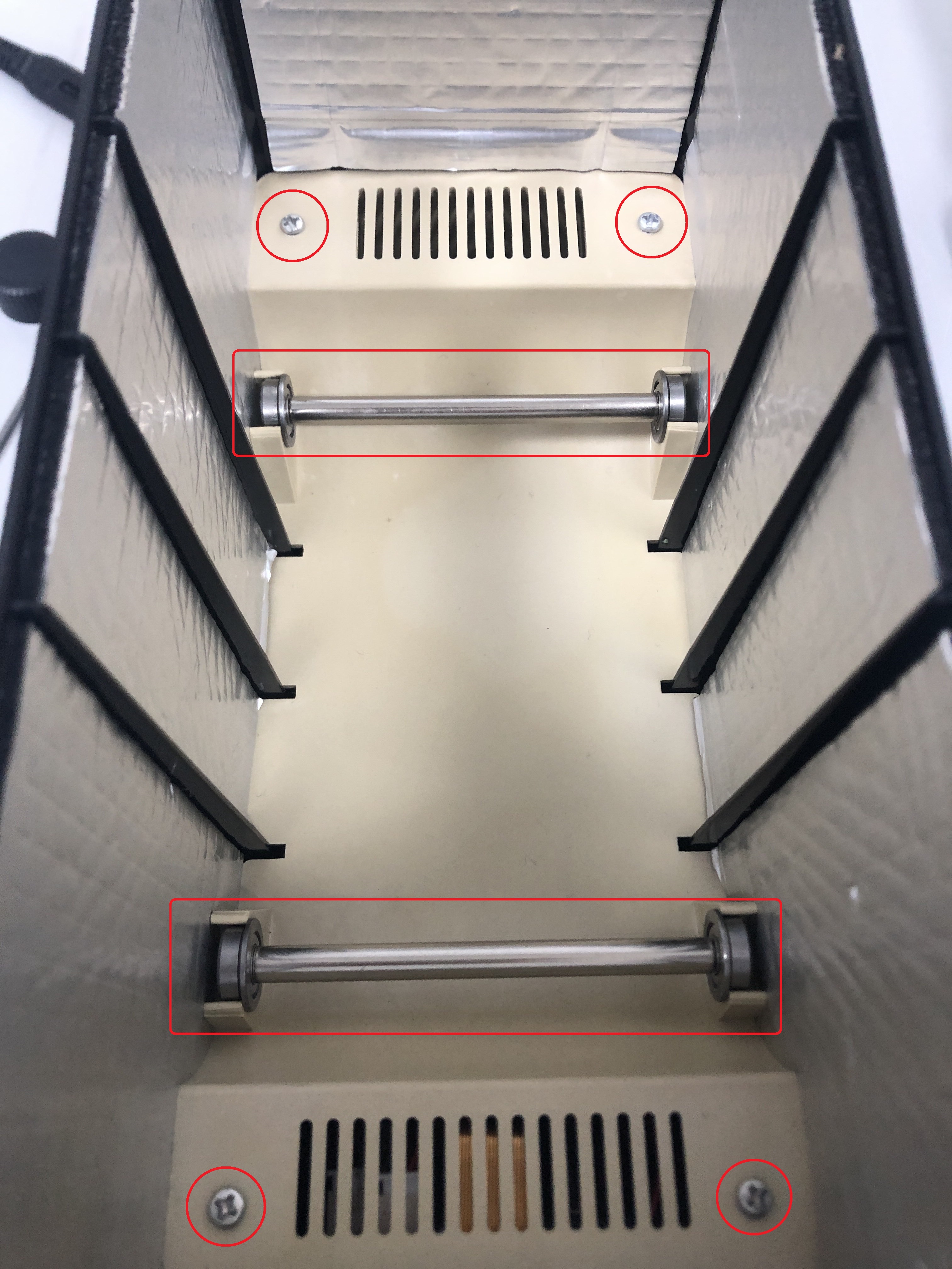 Undo the four philips head screws holding the plastic floor down and remove the spool rollers (they are push fit)